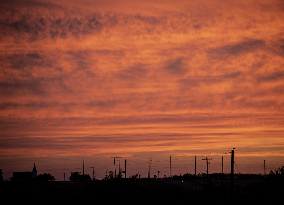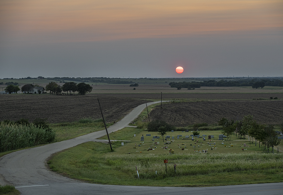 This is a view from the village of Coupland, Texas that perhaps gives you a sense of what I’m talking about when waxing poetic about the Blackland Prairie. If you visit my area, take a look at the color of the soil. That aside, through the years, I’ve taken a version of this photo from ground level as the road caresses the St. Peter’s Church Cemetery. The road winds around, becoming a dirt road leading to a decrepit bridge over Brushy Creek. Note that the bridge in question is not the nicer truss bridge east of here. The bridge at the end of this road is falling apart. During my one visit there a few years ago, a rattlesnake had issues with my presence. She probably didn’t get much interaction with humans. Needless to say, I’ve not returned. The high vantage point for this image was made possible by the kindness of a man who lived on a hill across the road. With no notice at all, I pulled to a stop in his driveway, knocked on the door and asked if I could take a photo from his property. The sun was going down fast. He was kind enough to allow the intrusion. I offered to send him a photo, but haven’t heard back yet. Frank Armstrong, one of my UT-Austin professors in the early 70s made a photo along this road a number of years ago. Thankfully, development hasn’t marred the landscape. Yet.