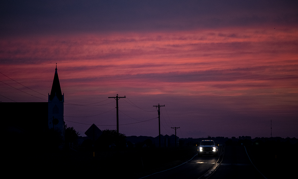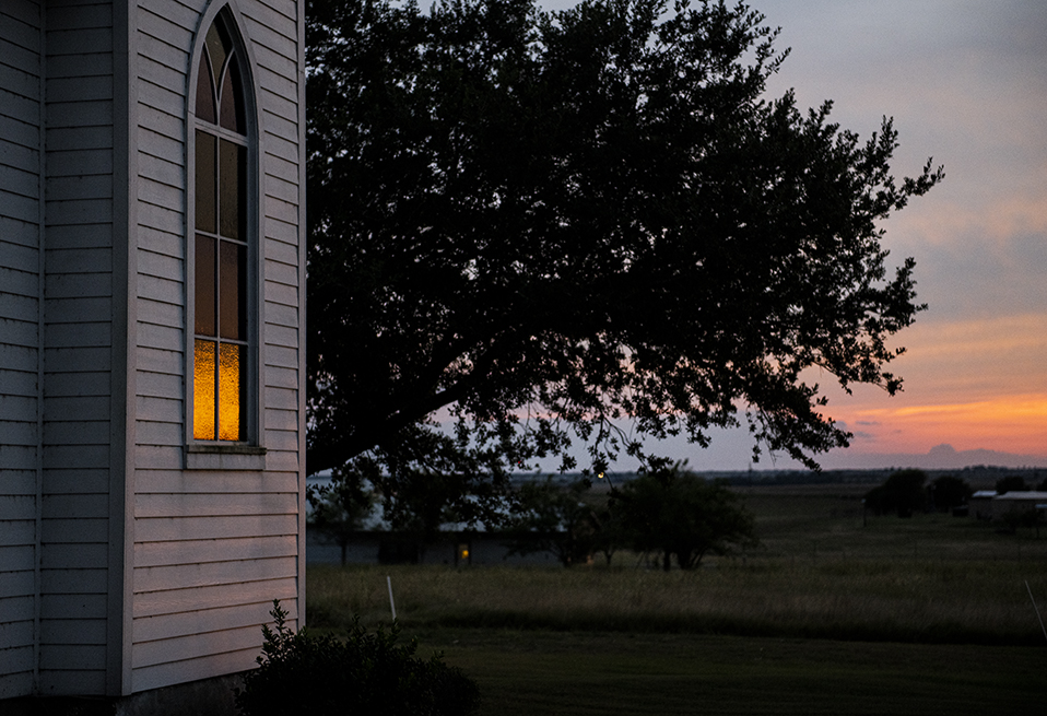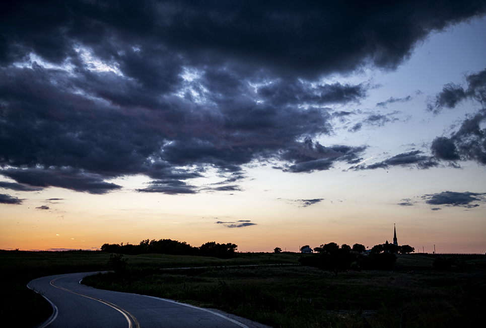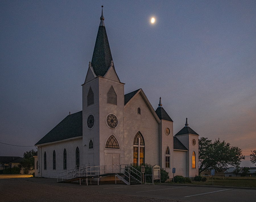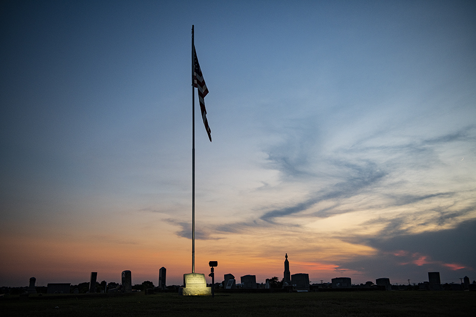 Last night’s goal was to come away with another photo of New Sweden Evangelical Lutheran Church. Alas, things didn’t line up like I’d hoped. However, as I headed for home, the church’s cemetery, about a mile west, provided some inspiration. The day’s light was fading, calling attention to a lighted monument just under the American flag. Once the wider photo was made, I stepped up to get a closeup of the monument, included here. The church will be there next time.