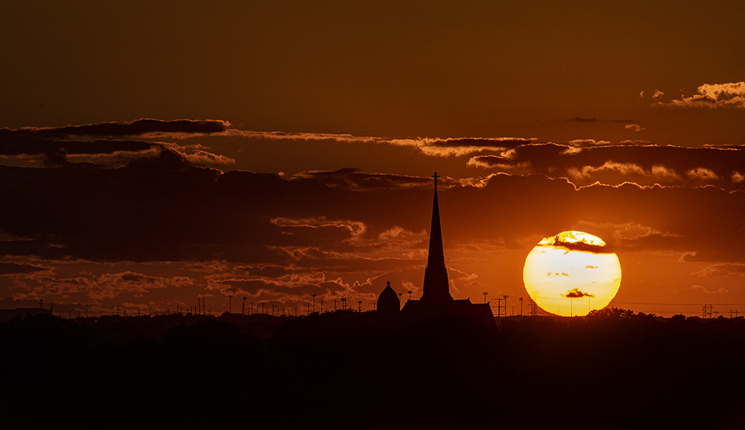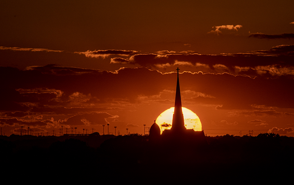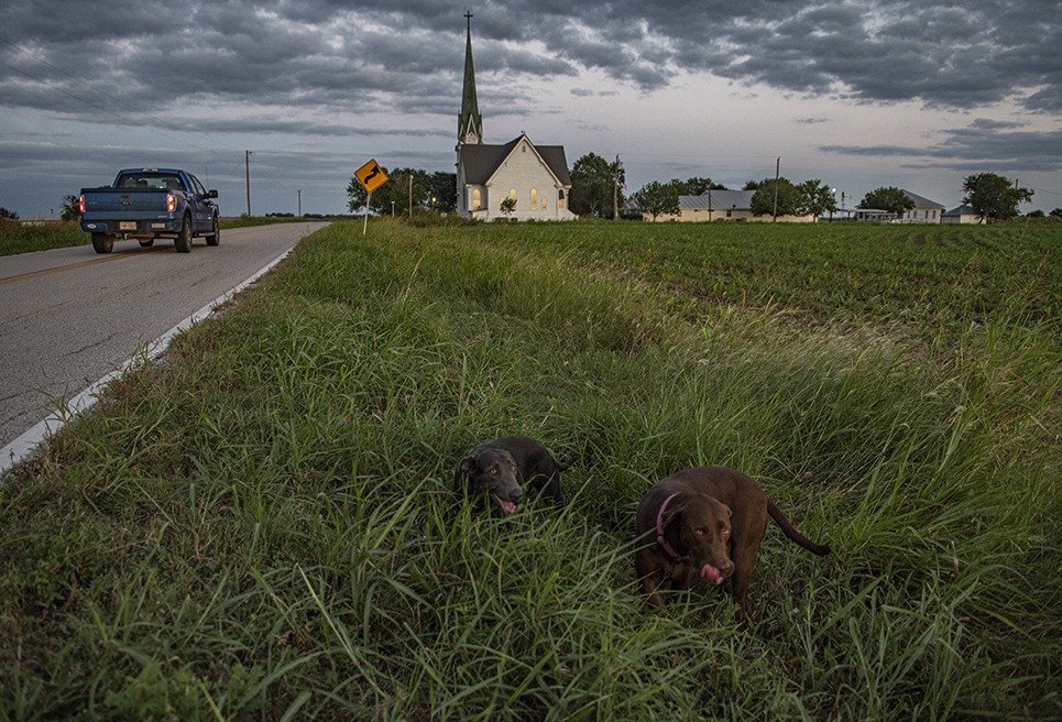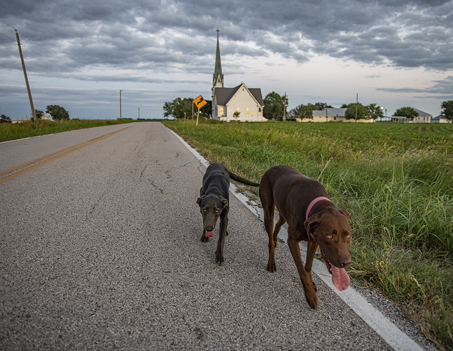 Perhaps mentioned a few times before, but it bears repeating tonight. Not long after moving home to Texas in the summer of 2009, I was taking a less-traveled road to Austin. Looking into the far distance, this incredible spire literally seemed to fly out of the earth. I later learned this was New Sweden Evangelical Lutheran Church. The congregation was formed by Swedish immigrants in 1876. The current structure, with its 104-foot tall copper spire, began to take shape in 1921, completed two years later. It’s still an active church today, only a few miles northeast of Manor, in Travis County. Regarding tonight’s photos, I’ve recently traveled along a road about a mile east of the church, thinking there might be a sunset image to be made. It didn’t work out last week, but did when these were taken last night. In addition to the opening photos, others are included. The post concludes with two friendly dogs who felt compelled to tag along as I took photos. I spent a few minutes trying to coax them off the road. Alas, folks and their country dogs.