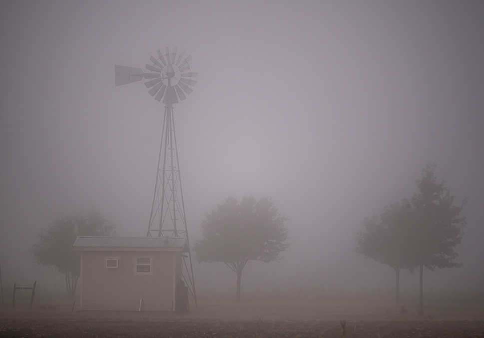 Saturday night’s rain in the Taylor area was followed by a lovely fog this morning. As always mentioned, fog clarifies and simplifies subject matter. This small collection begins in Murphy Park, then points just east of town. By 10am the fog was moving on, leading to a day that didn’t get beyond the 70s. Autumn is trying its best to get here.