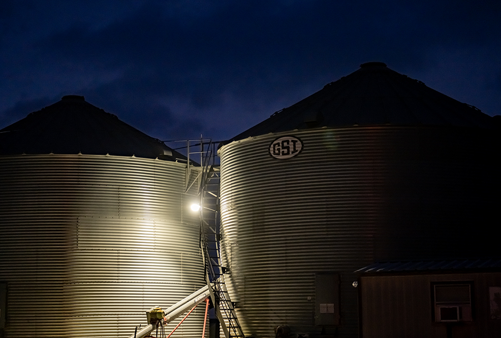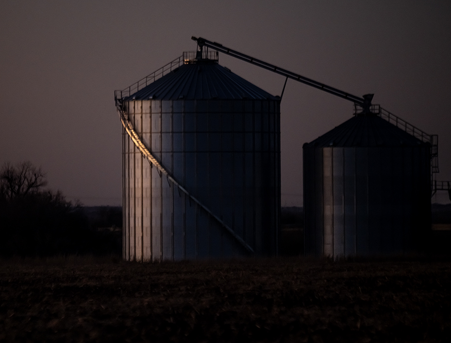 Grain elevators, or if you prefer, grain bins, are our version of pyramids. Blackland Prairie pyramids. These metallic wonders absorb light in wonderful ways. They serve a utilitarian purpose, but add a dash of elegance, too. These are from recent wanderings.