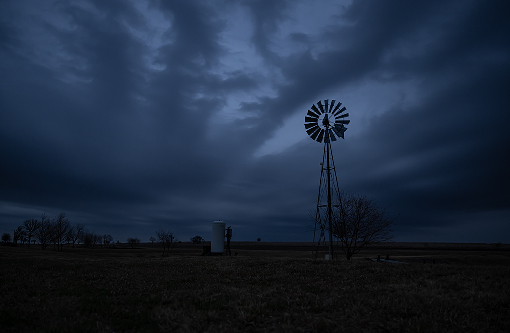 Photos taken at a friend’s farm on a cloudy evening adorned with blue light earlier this week. The friend’s windmill is impeccable, as are the trees, the landscape and a fine old barn. After two days of sunshine, the clouds are back tonight, with a good chance of rain tomorrow. The camera has been to this farm a few times before. If the stars align, other visits here are almost a certainty. It’s a quiet place.