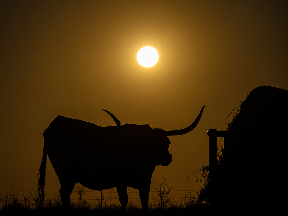 Princess, a beautiful Texas Longhorn, has been a photographic subject for several years. Princess is cared for by friend Joyce White at her ranch north of Granger. Princess, however, is almost always occupied when it comes to getting in front of the camera. On this visit, for instance, she and her pals had just received a new bale of hay. She didn’t cotton to modeling. Three of the four photographs are silhouettes , but as seen in the last photo, she seemed to be saying “enough!” So the camera guy moseyed on home.