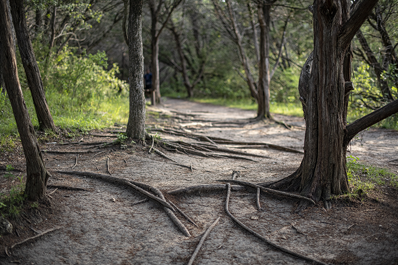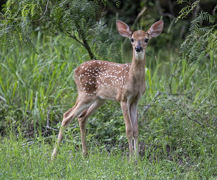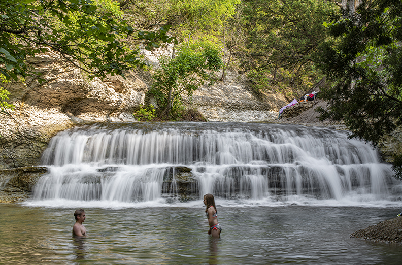 Chalk Ridge Falls Park is a good place to spend some time. And there’s no entrance fee. Located near the Lampasas River and Lake Belton in Bell County, it has a sweet waterfall. The trail system leading to the falls is pretty, but the footing was sometimes tricky, thanks in part to an abundance of recent rain. There’s a suspension bridge, too. Be sure to hold onto the cables when crossing. I was toting two cameras, three lenses and a tripod. If I can make it, anyone can! There’s only one place to get a straight-on shot of the waterfall. That involved walking along a very narrow trail. I’m pretty sure I heard a rattler nearby. We avoid each other. Once at the destination, I found a family who welcomed the intrusion. A dog named Cane figured out the rushing water. His human was there to help him along. Note that there’s movement in all the waterfall photos. I could’ve used a faster shutter speed with Cane, but decided to stick with the original plan. Almost back to the car, I happened on a curious little deer, probably not much bigger than our dog. Bambi. From my home in Taylor, it only took about 45 minutes to get there. From Georgetown, probably 30 minutes. From Austin, an hour. It’s along F.M. 1670.