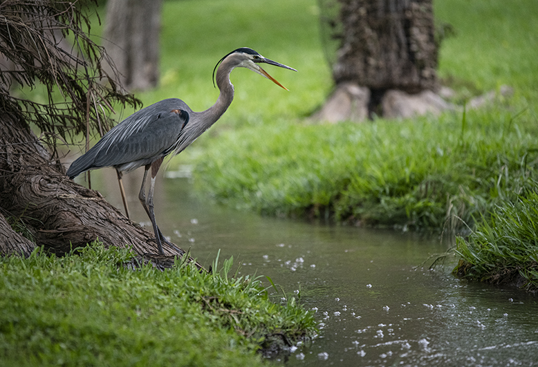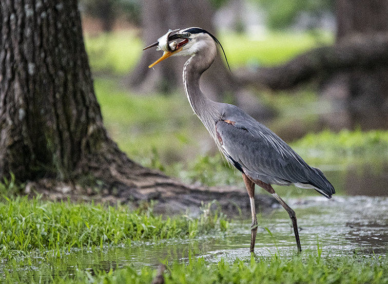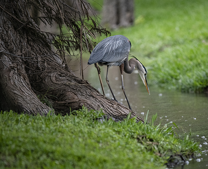 Earlier this week, I stopped by Taylor’s Bull Branch Park on an evening when the constant rain slowed down. With tripod in hand, my goal was to take photos of the fast-moving creek. I did that, but a visitor hunting for a meal appeared, seemingly unbothered by my presence. The longest lens I had was a 70-200mm. If you know focal lengths, you might surmise she was pretty close. So I watched her for a while. I’ve photographed Great Blue Herons for years, but seldom come away with a shot of them actually catching a fish. Luck was with me this time. She was so focused on task, I was able to shoot a couple of these at very slow shutter speeds. The tripod was handy. One image was just over a second, with no bird movement. The last photo is a five-second exposure. You can see her head move a little, but I like the scene. So there.