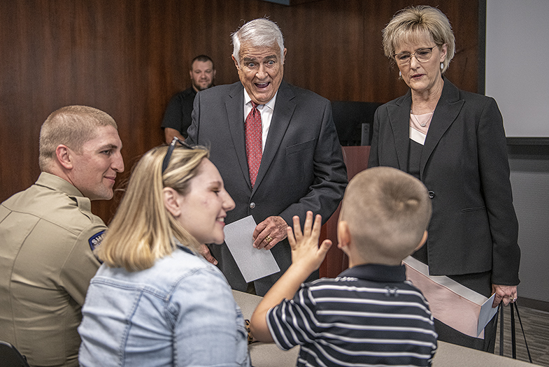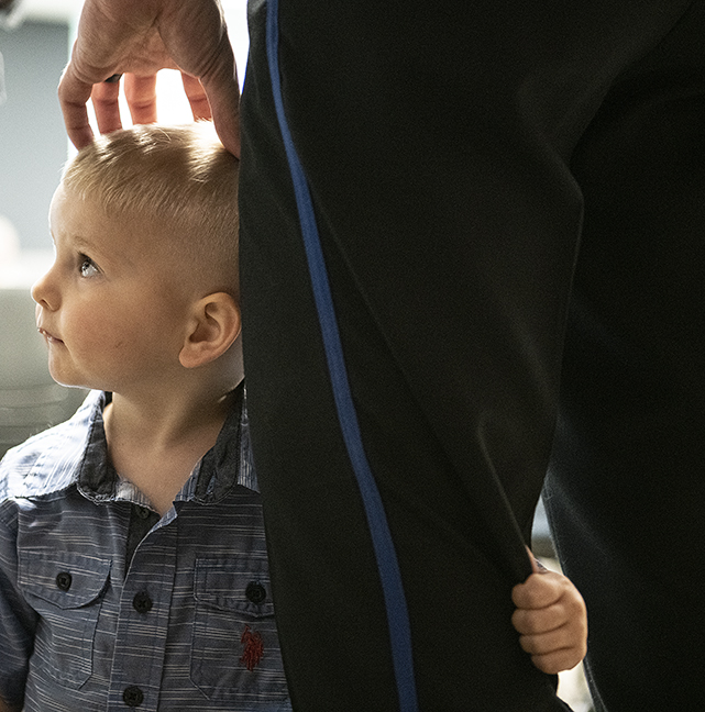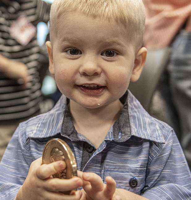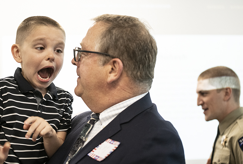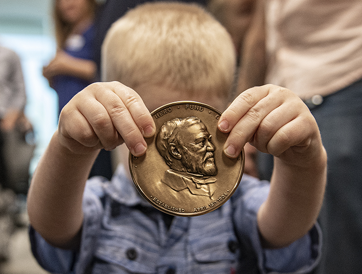 Each year the Carnegie Hero Fund Commission awards 18 Carnegie medals to civilians who’ve gone above and beyond the call of duty. One of this year’s recipients is Williamson County Sheriff’s Office Deputy Jonathan A. Hudash, who was presented the medal this morning in Hutto. I was there for the Austin American-Statesman. Family members, including Hudash’s parents and grandmother, traveled from Irvine, California for the event. His immediate family was here, too, including 2-year-old Grayson, shown holding onto daddy in the opening photo. Grayson’s also holding onto daddy’s award in two photos. Also on hand was Hudash’s wife, Lexi, and their 5-year-old son, Carter. The award was presented by Congressman John Carter. On April 15. 2020, Hudash responded to a serious vehicle accident in Round Rock. A 22-year-old man was trapped in a burning van. Despite intense heat and flames, the deputy was able