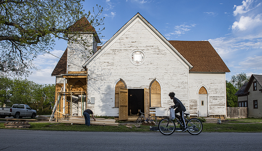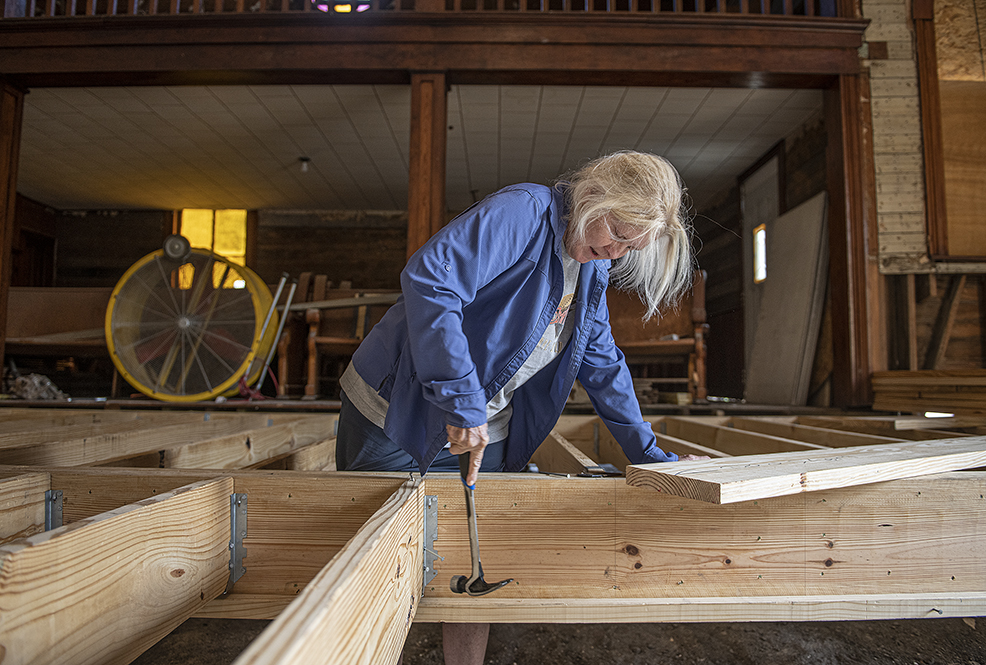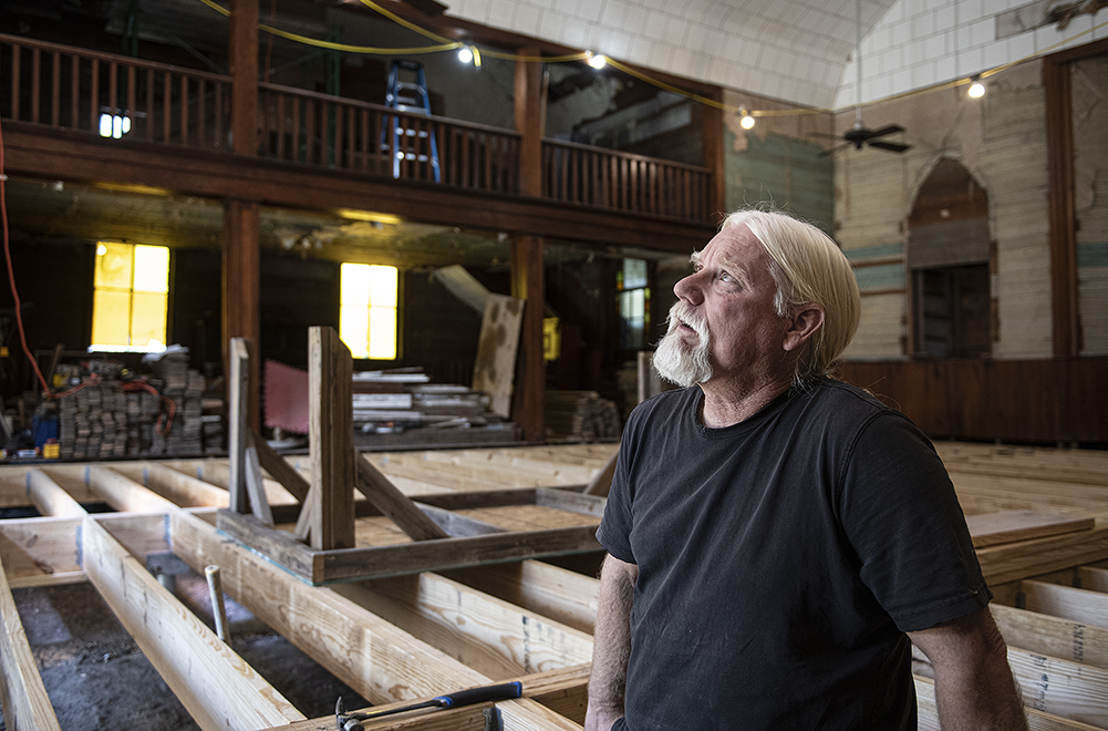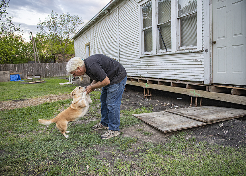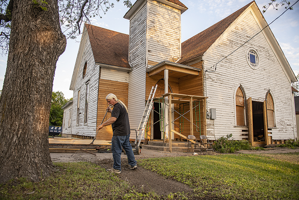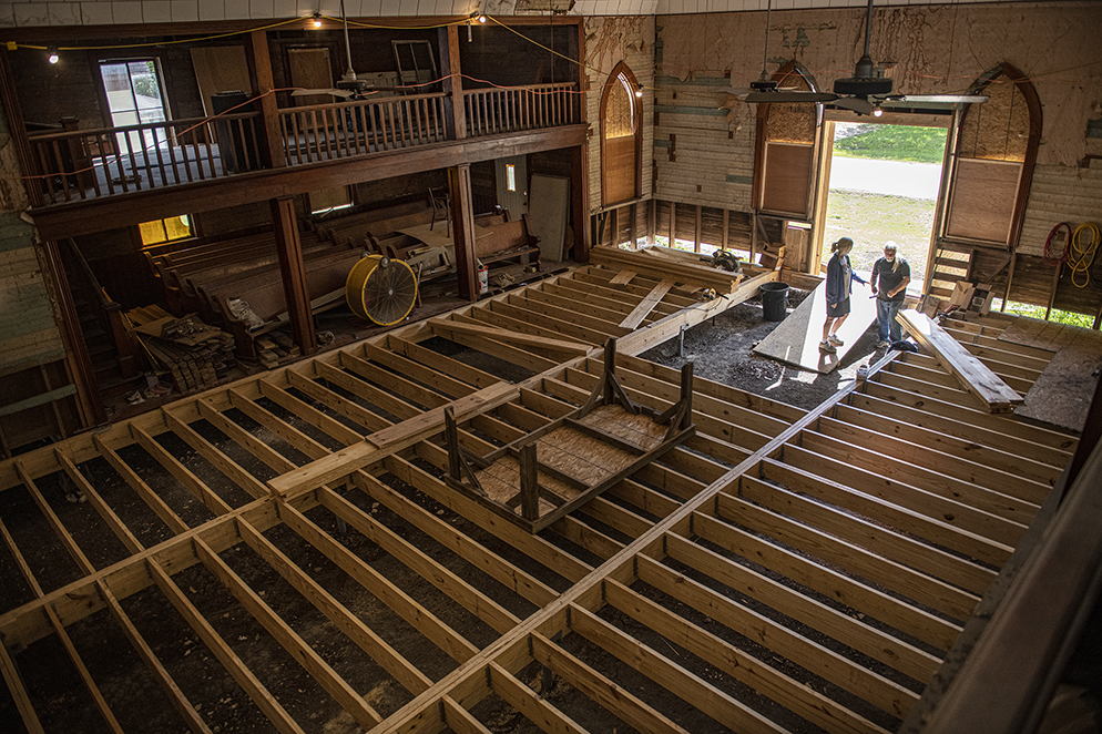 This is a continuation of photos from the restoration of what was once Granger United Methodist Church, a circa 1904 structure which closed its doors in early-2019. Later that year, Robert and JoAnn Halstrom, a couple from Wimberley, purchased the 4300 square foot structure. Since then, they’ve worked many hours there. Robert, a baggage handler with American Airlines, took a leave of absence to devote time to the project. JoAnn, a rural postal carrier, spends as much time as she’s able helping out. The pandemic slowed down things a bit last year, but work progresses. Foundation repair and leveling work, a three-month effort, has just been completed by a San Antonio-based company. 14 stained glass windows are getting a complete makeover by Cavallini Company, also based in San Antonio. Work continues. Now they’re beginning to replace the sanctuary flooring. What’s the future for the church? They’re not sure. It could be their home, or a restaurant, a bed and breakfast, or an events center. There’s time. Work is expected to take well into 2022. When JoAnn’s in Wimberley, Robert has his dog Ladybug, keeping him company. I do love historic preservation.