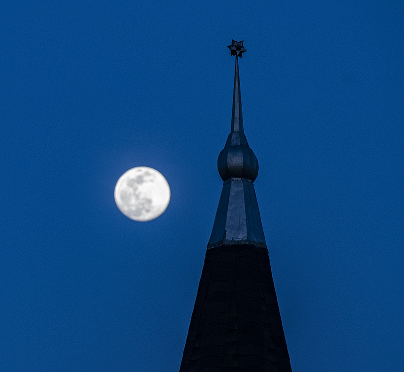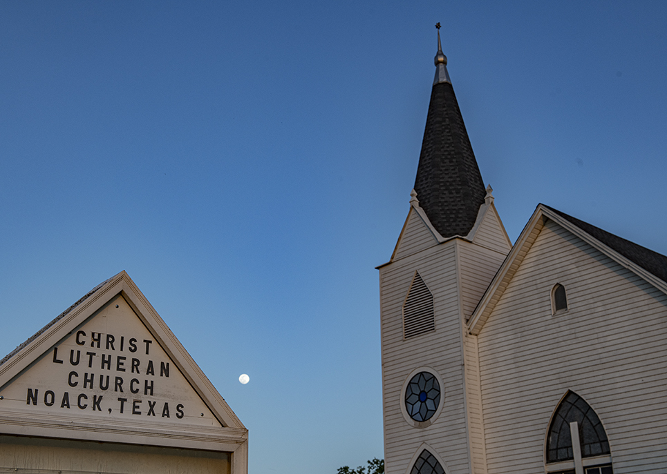 Tonight’s Waxing Gibbous moon is 98% visibility, almost full. My view this evening was in Noack, Texas, at Christ Lutheran Church. The German congregation formed in the 1880s. The first church was built on this site in 1902. The current church was dedicated in 1916. Until 1922 services were conducted only in German. It’s a regal old church, weathering all that comes its way.