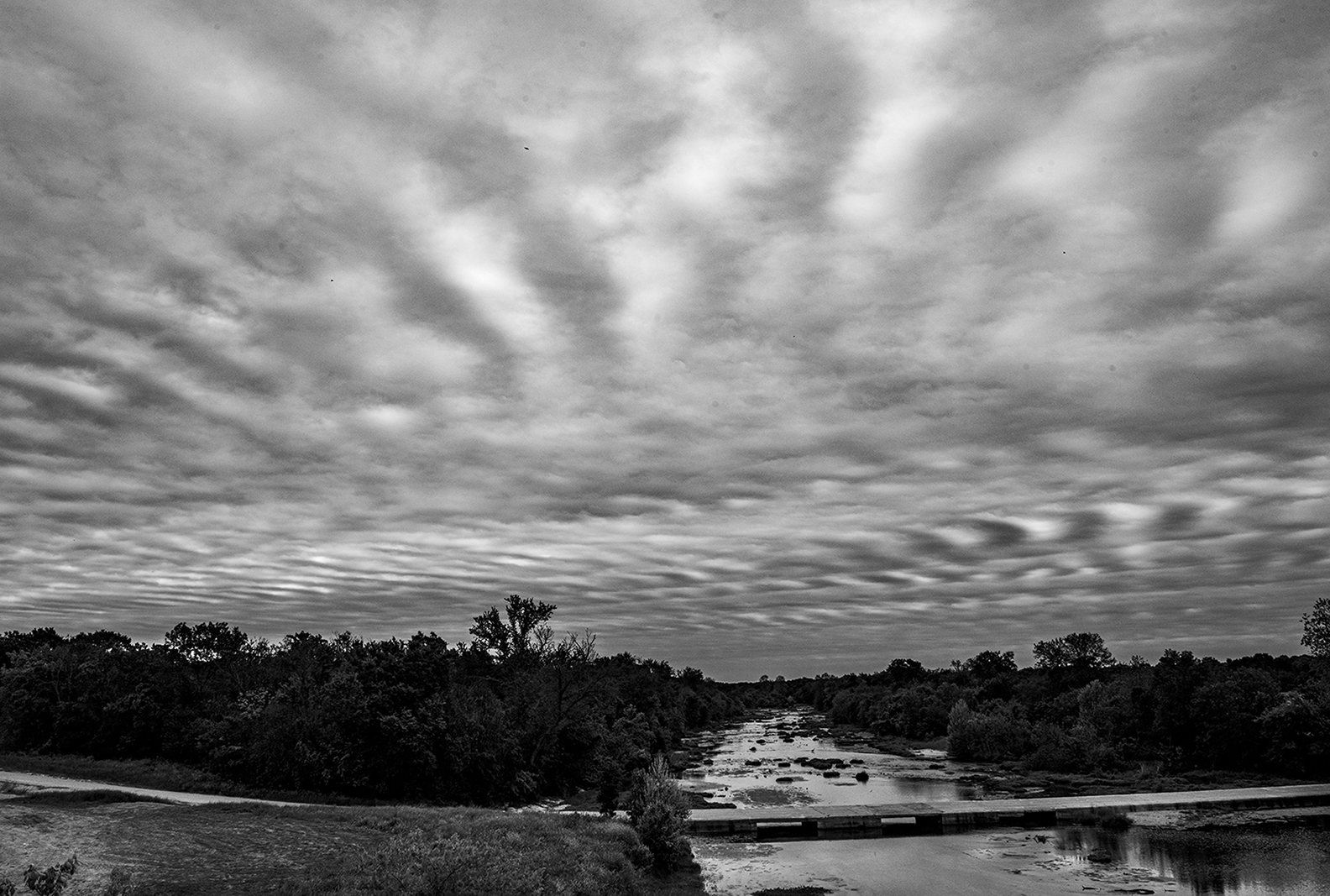 Driving from Taylor to Georgetown this morning, I noticed the sky above a bit of the San Gabriel River. As it was an already gray morning, this image is presented in black-and-white. The others two photos were taken in Taylor this evening, skies above Williamson County Grain. Just some Texas skies.