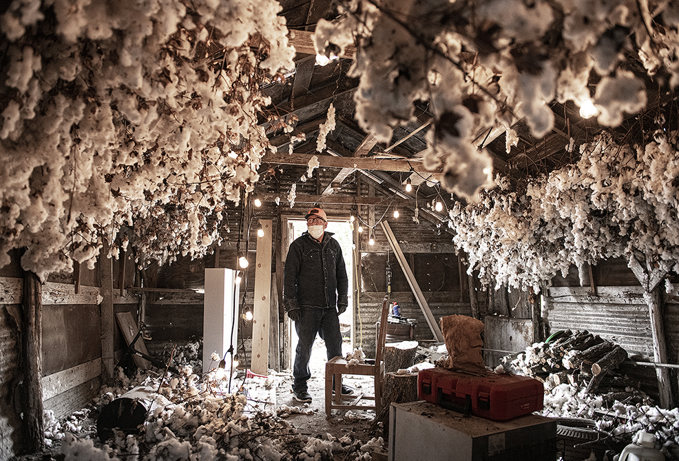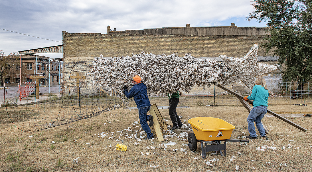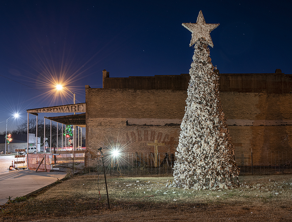 Once again this year, Granger’s Mike Anderson has put together a cotton Christmas tree for his town. It’s 25 feet tall, made entirely of cotton harvested from area farmers. With steel rebar used as a form, he estimates it weighs several hundred pounds. Saturday I watched while he worked. Ready to stand it upright, he sought help from friends, but in the end he used a crane to get the job done. Cotton was stored in an old smokehouse. Anderson says he used every bit, too. It’s up and lighted tonight. Take a drive along West Davilla Street after sunset and take a look. It’s unique.