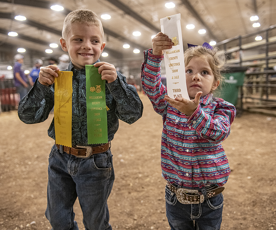 I really love photographing kids and their pigs during the swine show segment of the 75th Annual Williamson County Livestock Show, held this year at the Williamson County Expo Center in Taylor. Included here are some scene photos from this evening. The young fellow in the opening shot is congratulating her little sister after she had a turn in the ring with her pig. Big brother also had a good showing. The youngest competitors so far this year are siblings, ages 2 (her) and 3. Their daddy said they’d been around pigs all of their young lives. Just some scenes, friends.
