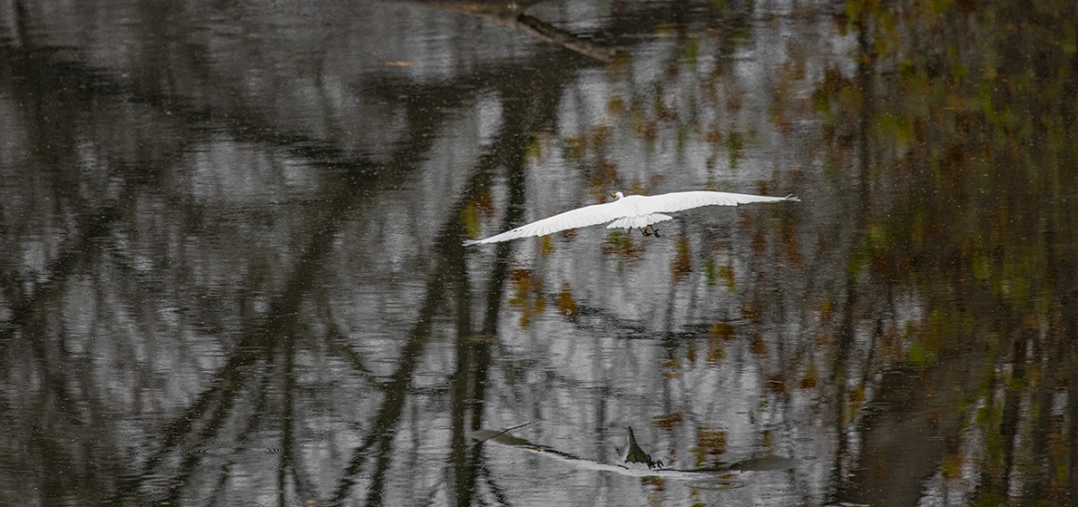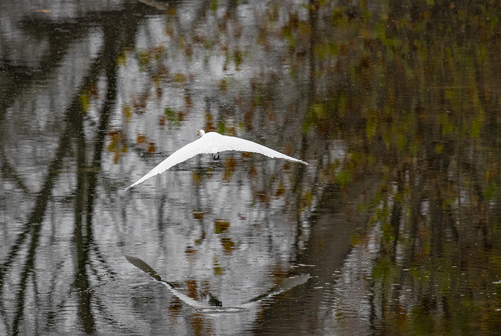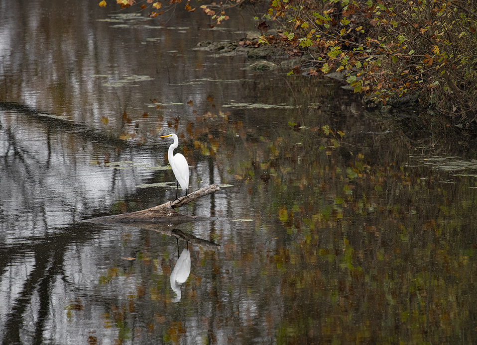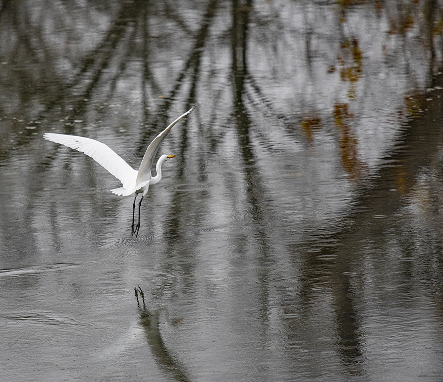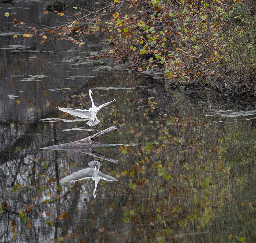 As I was taking in a bit of autumn color at Berry Creek yesterday, a Great Egret entered my field of view, flitting back and forth above the water in search of sustenance. Watching the activities of birds, any birds, is relaxing. While snapping photos, a voice behind me mentioned that he’d recently seen a deer by the creek, in close proximity to a heron. Turning to the voice, I met an older gentleman, wearing a cap telling me he’d fought in a particular war. There wasn’t much traffic on the bridge so we got to chat a minute. Before leaving, he said “You made a good choice to shoot with a camera, not a gun.” My sense is that what he saw in battle affected the way he saw the living things in his world. It was a good few minutes.