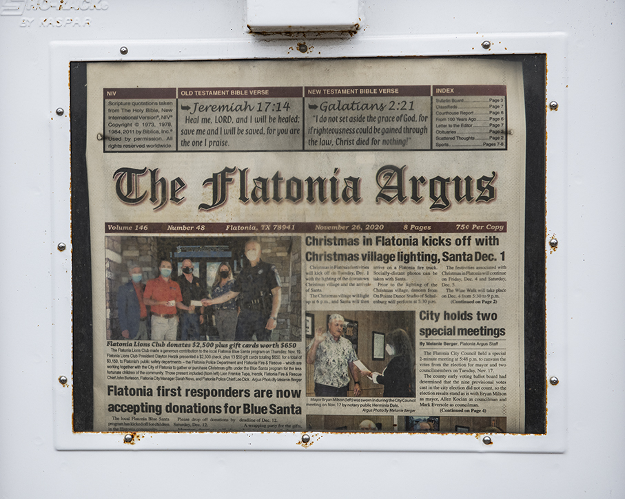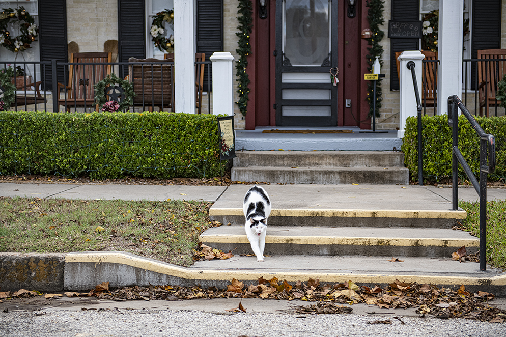 In recent weeks, when time allows, we like to take little weekend drives around our part of Texas. Sunday’s drive took us about 90 minutes south of Taylor, , to the community of Flatonia, a relaxing town of a bit over 1400 in Fayette County. A longtime friend has mentioned the town many times on Facebook. The picture she painted made this a good choice. Since the arrival of Interstate 10 years ago, U.S. 90, which goes through Flatonia, is a quieter stretch of road. The railroad runs through town. Flatonia was chartered in 1873, named for Fredrich Wilhelm Flato. German and Czech roots run deep. There’s the Lyric Theatre, which appears closed, but a sign on the front suggests a new life very soon. That would be neat! There’s the Olle Hotel, built as a private residence between 1896-1901, becoming a hotel in 1915. It’s still open for business, with a few nice cats around serving as greeters. An establishment on West Main Street (also U.S. 90) sports a cowboy hat in the window. It looks like a place for commerce. The opening photo was taken inside what appears to have once been a hardware store. I took advantage of an open door to step inside for a different view of town. I like the hitching posts, once pretty useful here. Flatonia even has a newspaper, the Flatonia Argus. I paid 75 cents for one straight off the rack. It was a good afternoon. Flatonia is a charming bit of Texas. And America. Thank you, Peggy, for this inspiration.