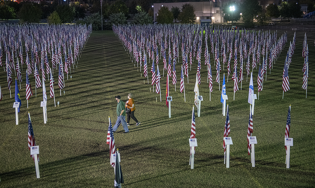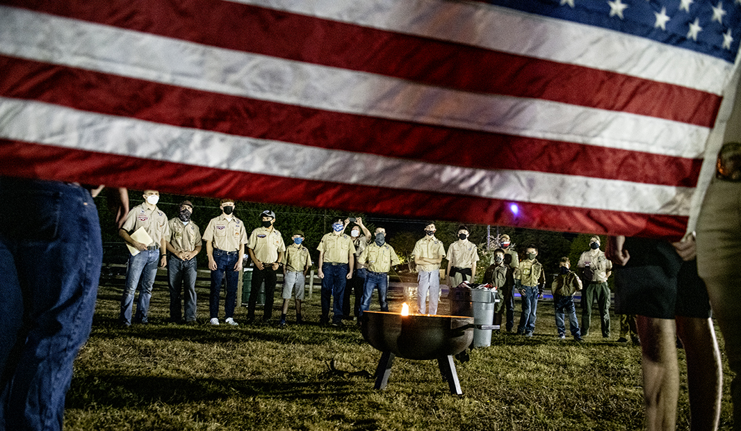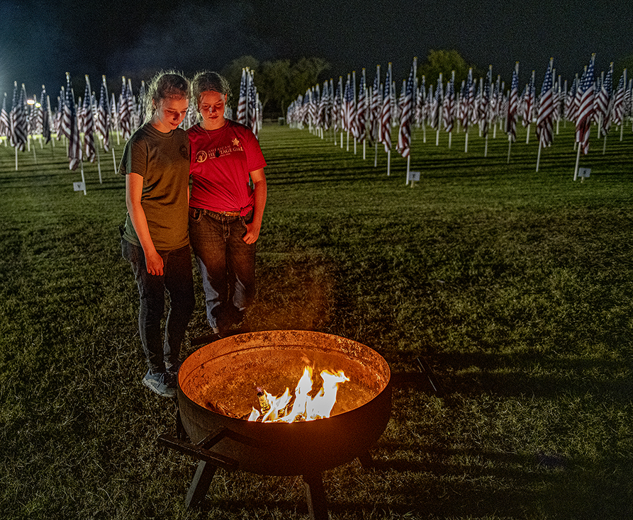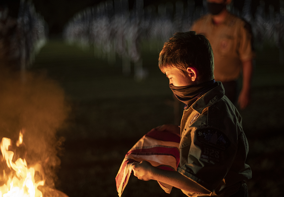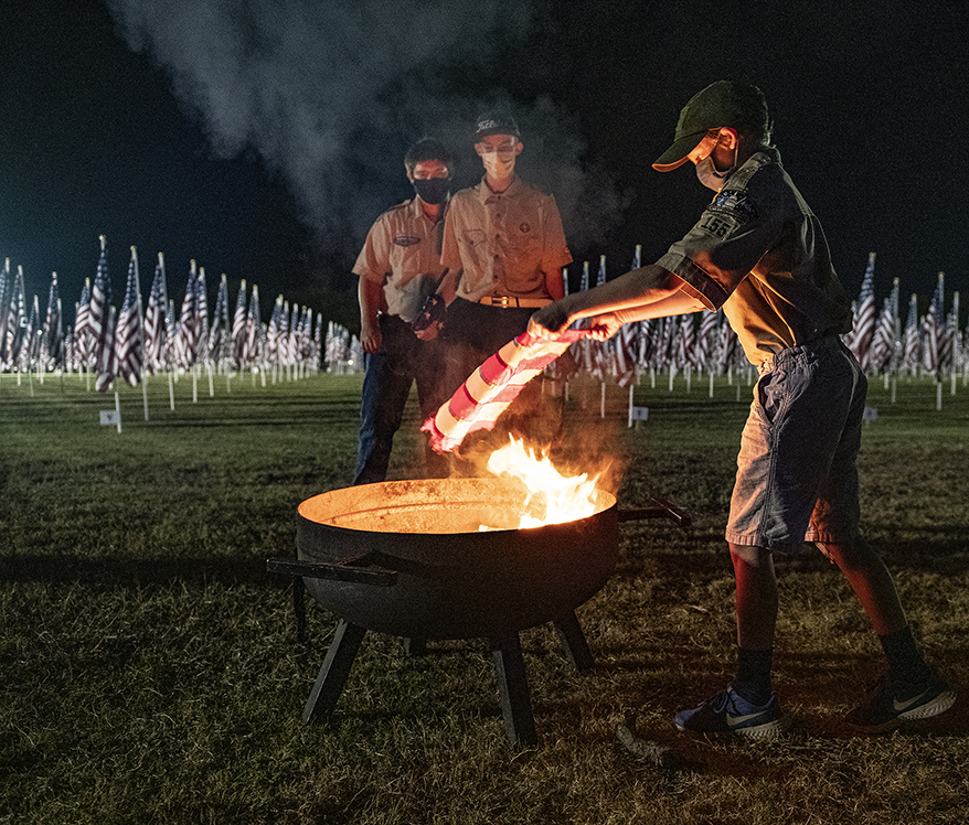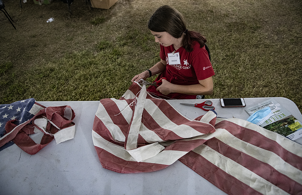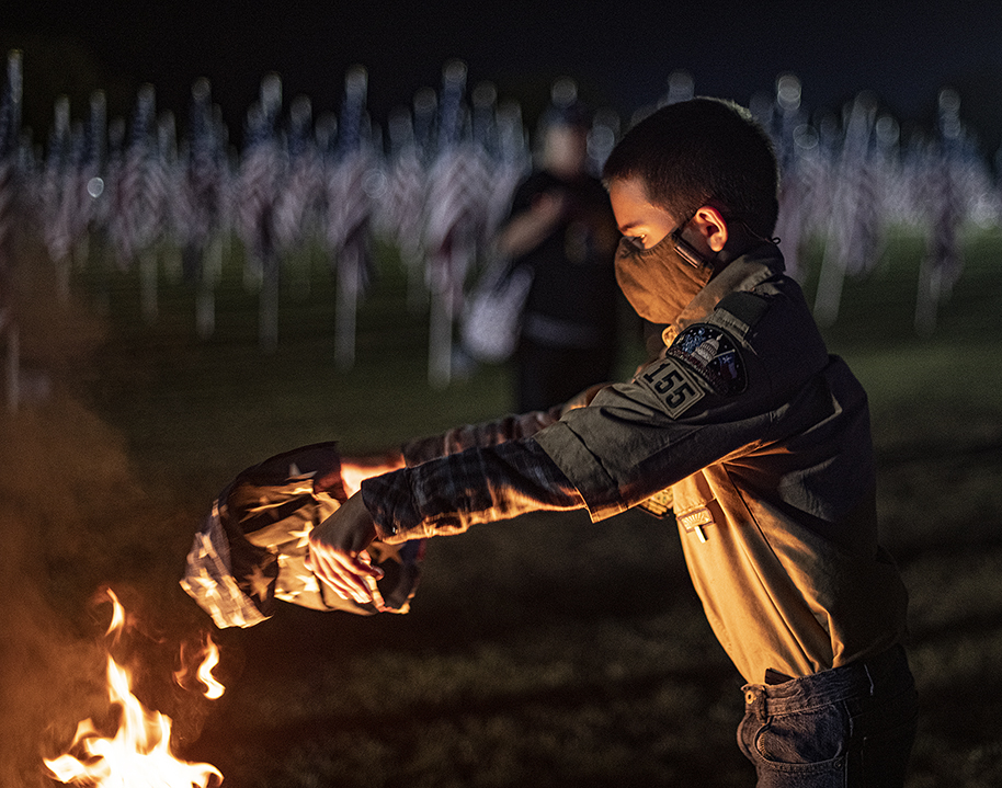 When an American flag has come to the end of its work, it’s traditional to send it to the fire. For years, Boy Scout troops have performed the ritual. Monday night I was present at this year’s Field of Honor as Georgetown Boy Scout Troop 155 sent old flags to the flames. They were assisted by American Heritage Girls Troop 1045, who are also conducting their own flag retirement ceremonies here this week. Before they are retired, the flags are cut into strips, making it easier to feed them into the fire pit. These youngsters retired thirty flags last night. It’s a moving thing to see, particularly at night, with a backdrop of 1700 flags nearby.