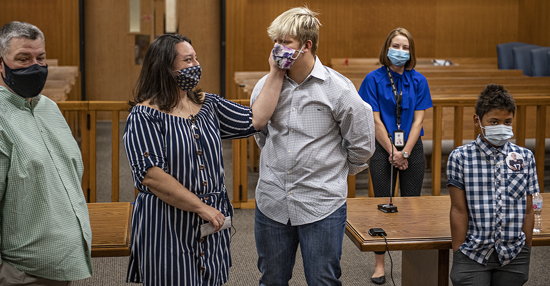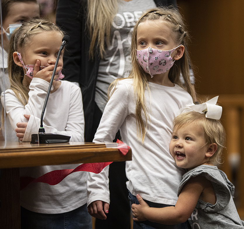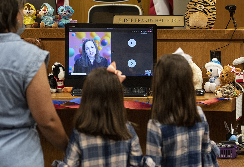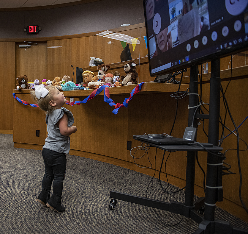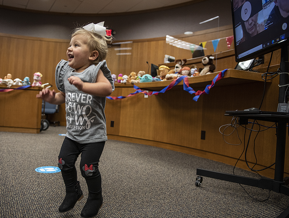 Last year I covered adoptions in Georgetown, Texas, one of the most heartfelt events I saw all year. This year, because of the ongoing pandemic, adoptions were held, but much of it was done remotely. A few families, however, were able to enter the courtrooms for their happy moments. The judge was there, via technology. These photos were made this morning. I was fortunate to be allowed into the courtroom to observe what unfolded. Among today’s families was a mom who prayed for the chance to adopt a teenager. Her wish was fulfilled when 16-year-old Brian became a new family member. A football player at an area high school, he wasn’t shy about showing his affection for what was happening. Then there was a grandma, adopting three young siblings, now becoming their mama. And a mom adopting sisters. Perhaps the most inspiring was a joyful 2-year-old, pictured at the end of this post. She was enamored with mama, her new siblings, but also seeing new family members on a big screen in the courtroom. Not everyone could be there this year, but it’s okay. The spirit is there.