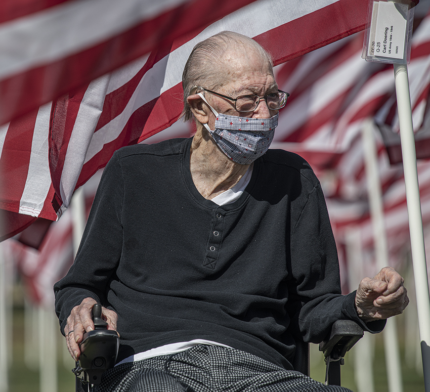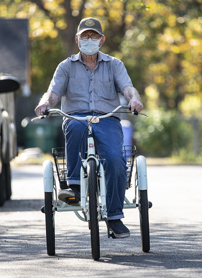 A Veterans Day observance was held today at the Georgetown Rotary Club’s Field of Honor, in San Gabriel Park. The opening photo is an active-duty mom stationed at Fort Hood, who came here from the family home in Copperas Cove. Her husband, also Army, is currently on assignment in Germany. One of the things about covering Veterans Day for a long time is finding less World War II veterans on hand. As I was about to leave, a man in a wheelchair was seen among the flags with his family. It turns out he’s 96-year-old Carl Doering, an Army veteran who served in the Philippines. He’s also a former Georgetown mayor. I was glad to see him. The final photo was taken as I arrived home in Taylor this afternoon. There was my 85-year-old neighbor, also a veteran, taking a spin on his adult trike. I had to add this good man to the mix this year.
