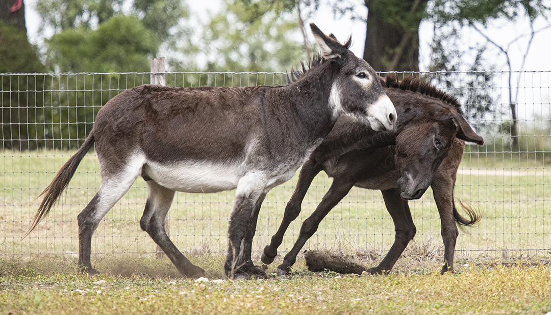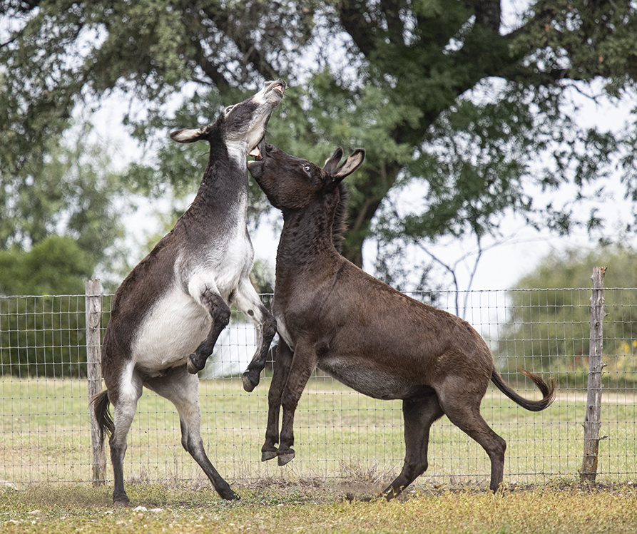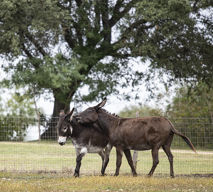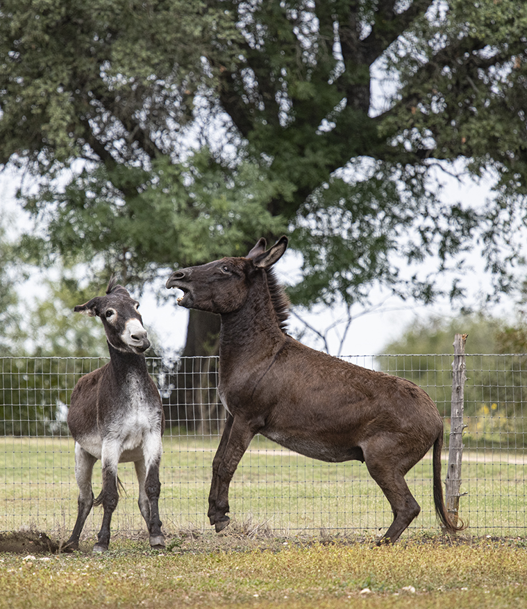 Pedro (with white face) and Lil’ Bob, the resident donkeys at Berry Springs Park & Preserve in Georgetown, love their play time together. It may look like they’re fighting, but it’s just a donkey’s idea of fun. When I used to visit them, I’d bring along some carrots or apples, but now the park asks that visitors just feed them handfuls of grass. The park makes sure these guys stay healthy and active.