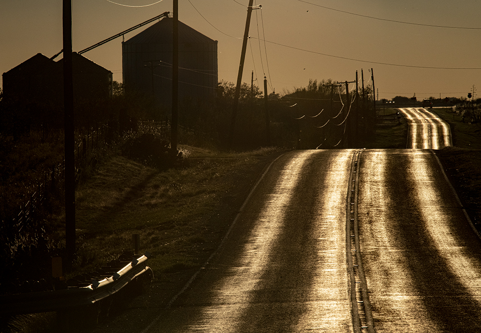 These two photos were made less than two miles from our home in Taylor, Texas. Clearing a field as the sun settles into the western sky. A county road leading to a friend’s grain elevators, a color image, but almost monochrome. I’ve been neglecting nearby scenes, but will try to remedy that when possible. Taylor, like many small Texas communities, is experiencing rapid growth, but I’m thankful good things remain. At least for now.