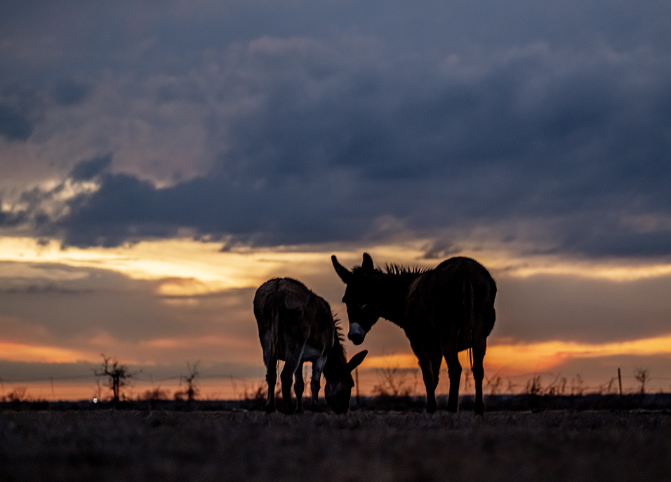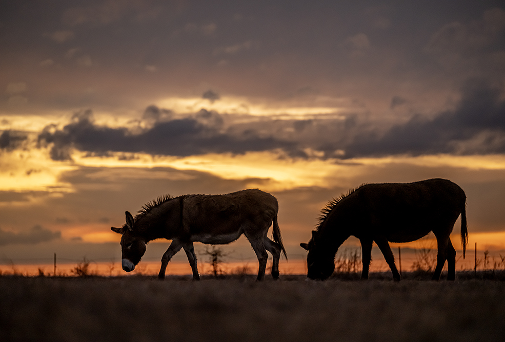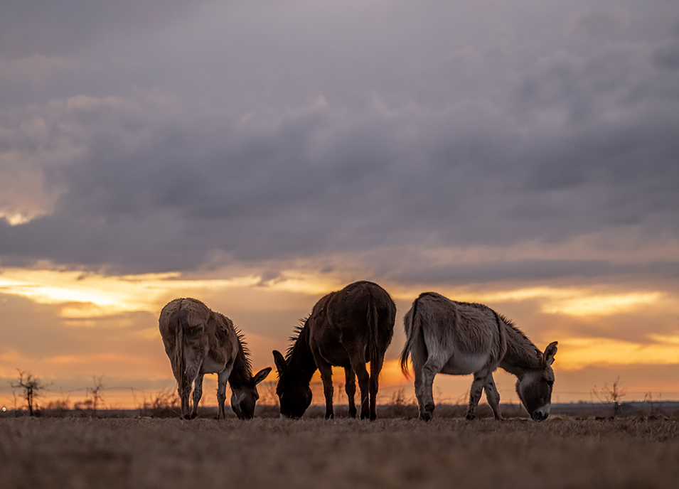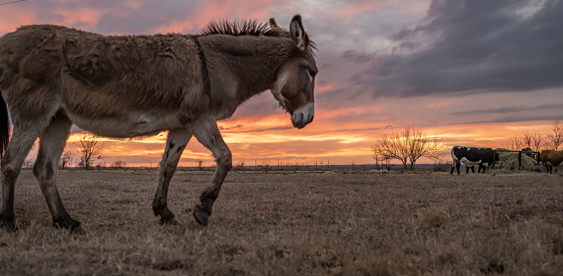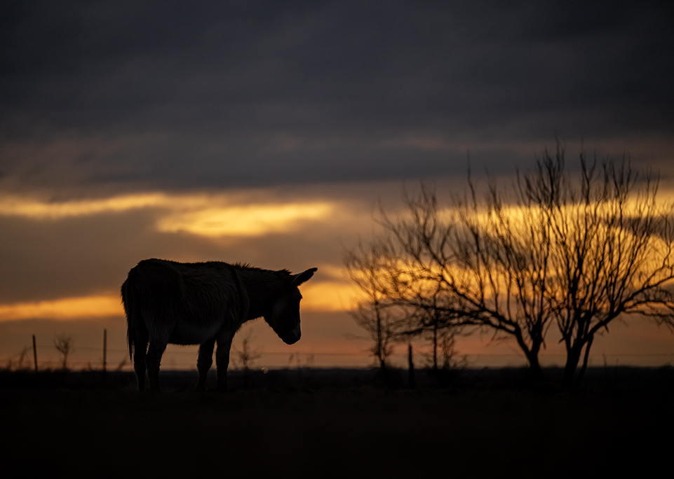 A friend’s pasture is adorned with donkeys and cattle. One of the cows is a Texas Longhorn. True to form, the longhorn was camera-shy tonight. The donkeys, however, relished the attention. So it’s just some fine-looking donkeys this evening. They merit the camera’s attention.