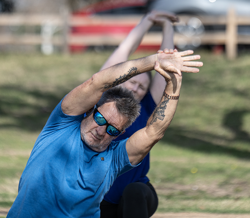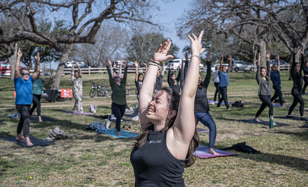 Some photographic subjects are calming. On this personal list are sunrises, sunsets, barns, windmills and fly fishermen. Add yoga to this list. Even if the photographs don’t say it, watching yoga participants is serene. This morning’s subject was Yoga in the Park, held almost every Saturday morning by river in Georgetown’s San Gabriel Park. This free event is held by members of Flow Yoga. Anyone and everyone are welcome to participate. 55 people came to this morning’s hour-long session. A mom brought her 4-year-old, who rested quietly for the entire time. These sessions are only cancelled because of weather. And perhaps the three-day music festival coming io the park in a few weeks. That is not quiet, but yoga is.